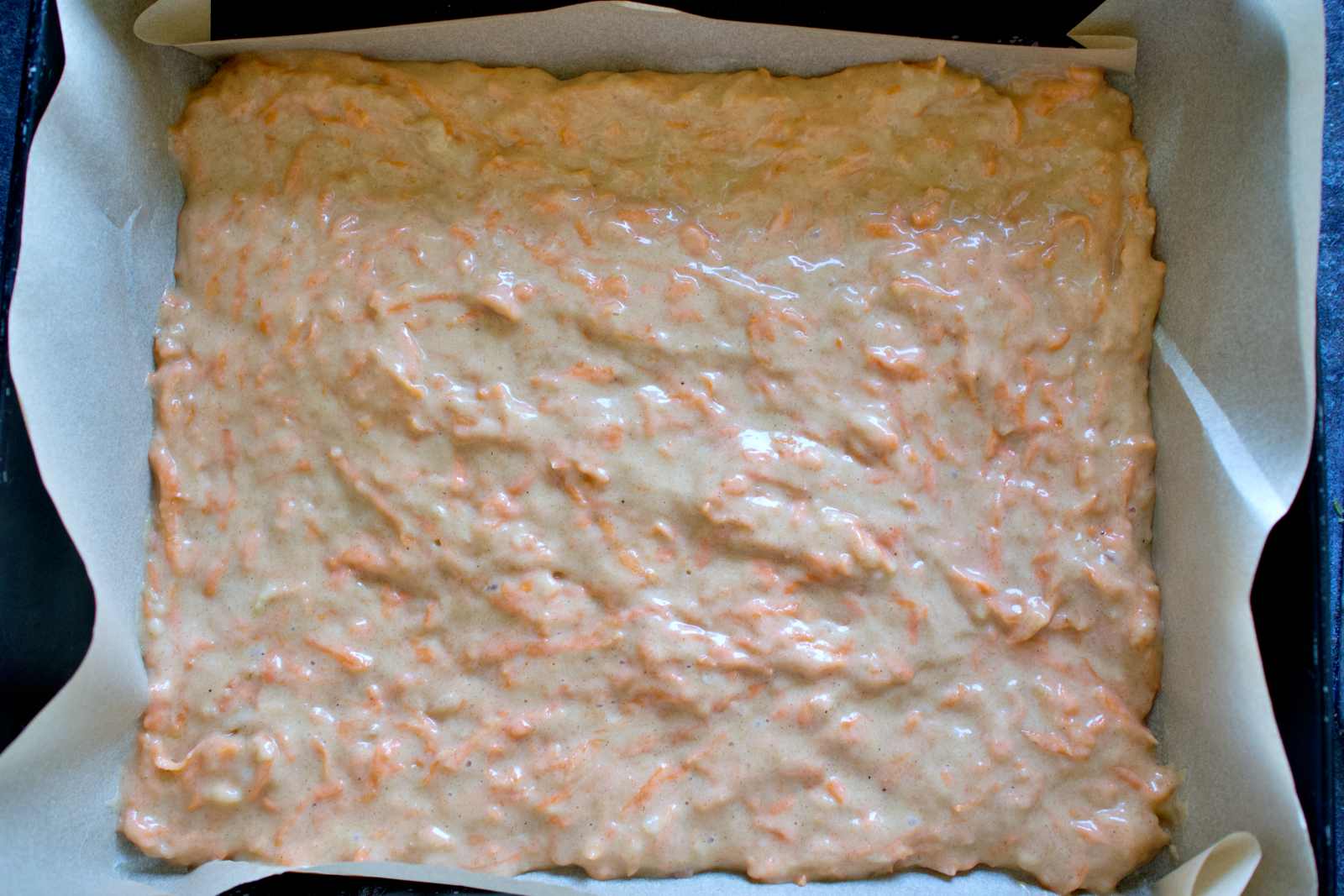Dodaj sypkie składniki i wymieszaj. Całość przełóż do wyłożonej papierem do pieczenia foremki na ciasto (u mnie forma o wymiarach 24x28cm).