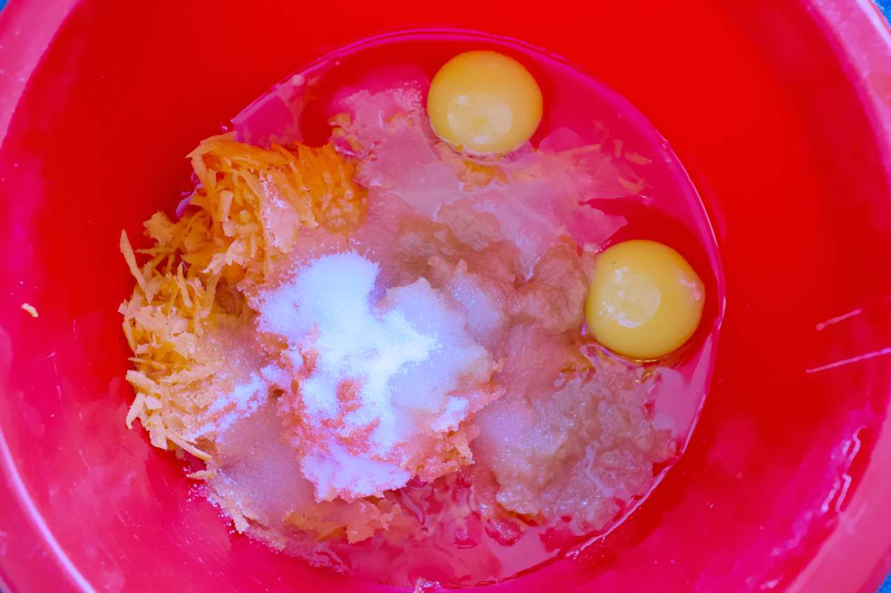 Do drugiej miseczki daj: 150g startej marchewki na grubych oczkach (odciśnij sok z marchewki, jeśli jest go dużo), wbij 2 jajka, dodaj 60g musu jabłkowego, 90 g cukru i 80g oleju, wymieszaj.