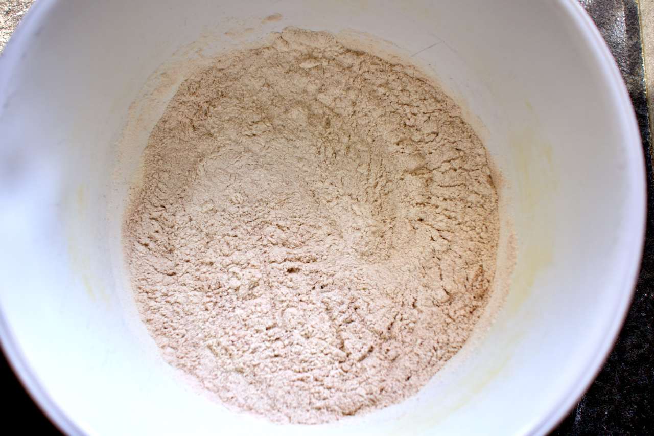W miseczce wymieszaj sypkie składniki: 130g mąki, 1 łyżeczka proszku do pieczenia, 1/2 łyżeczki sody oczyszczonej i przyprawy: 1 płaska łyżeczka cynamonu, 1/2 łyżeczki imbiru, 1/4 łyżeczki soli i szczypta gałki muszkatołowej.