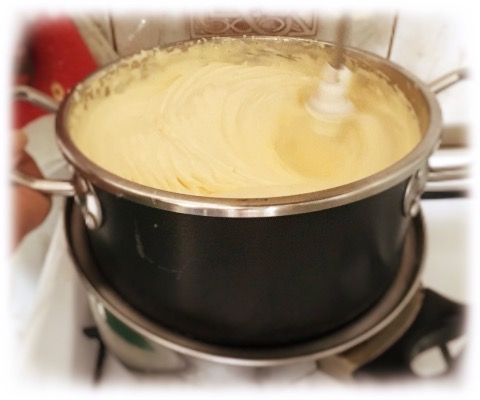 Przygotuj mąkę, mleko i masło i jajka. W dużej misce umieść przesianą mąkę. Mleko lekko podgrzej a masło roztop w rondelku na małej mocy palnika. Zagotuj wodę w większym garnku. Do mniejszego daj jajka, żółtka i cukier. Zacznij ubijać i postaw garnek na większym garnku z gotującą się wodą. Ubijaj nadal do uzyskania puszystej masy.
